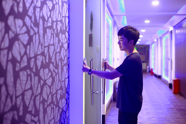 在前台办理好入住手续后,胡振宇直奔二楼的酒店住宿区,“这个酒店给我印象最深的就是干净、卫生、安全、有科技感。整个酒店非常干净,进入住宿区需要刷卡,然后换成酒店提供的消毒的拖鞋,而且不准穿出去。”
